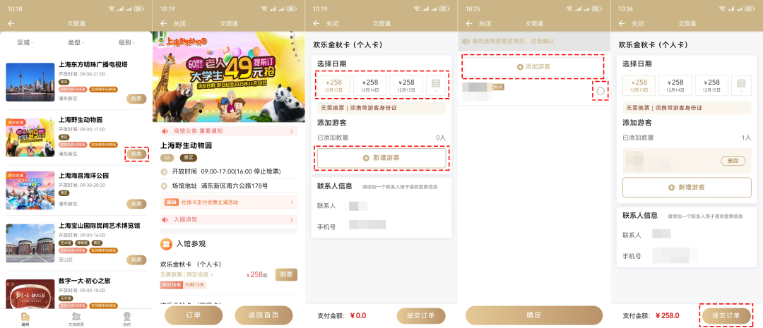 點(diǎn)擊景點(diǎn)/景區(qū)的“購(gòu)票”鍵(以上海野生動(dòng)物園為例)→確認(rèn)購(gòu)買的票種,點(diǎn)擊“購(gòu)票”→選擇游玩時(shí)間,點(diǎn)擊“添加游客”,添加并勾選確認(rèn)購(gòu)票人信息→點(diǎn)擊“提交訂單”→完成支付。