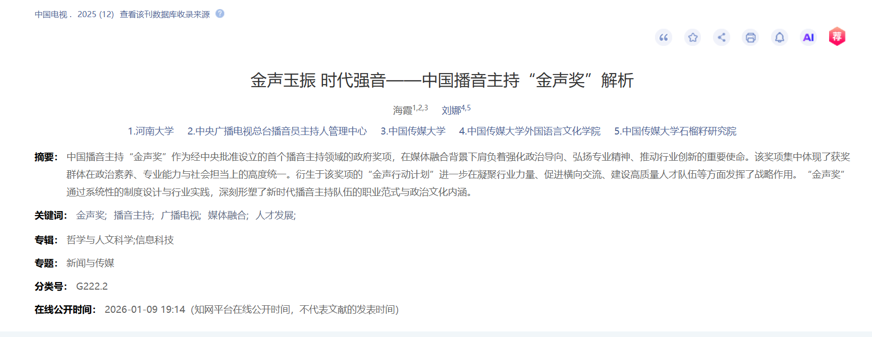 例如,《中國電視》雜志2025年12月號就刊發(fā)了海霞作為第一作者的文章《金聲玉振 時代強音——中國播音主持“金聲獎”解析》。文章的第一署名單位正是河南大學(xué),第二署名單位是中央廣播電視總臺播音員主持人管理中心。文章第二作者劉娜曾多次與海霞合作完成學(xué)術(shù)文章。劉娜系中國傳媒大學(xué)外國語言文化學(xué)院師資博士后,中國傳媒大學(xué)石榴籽研究院研究員。