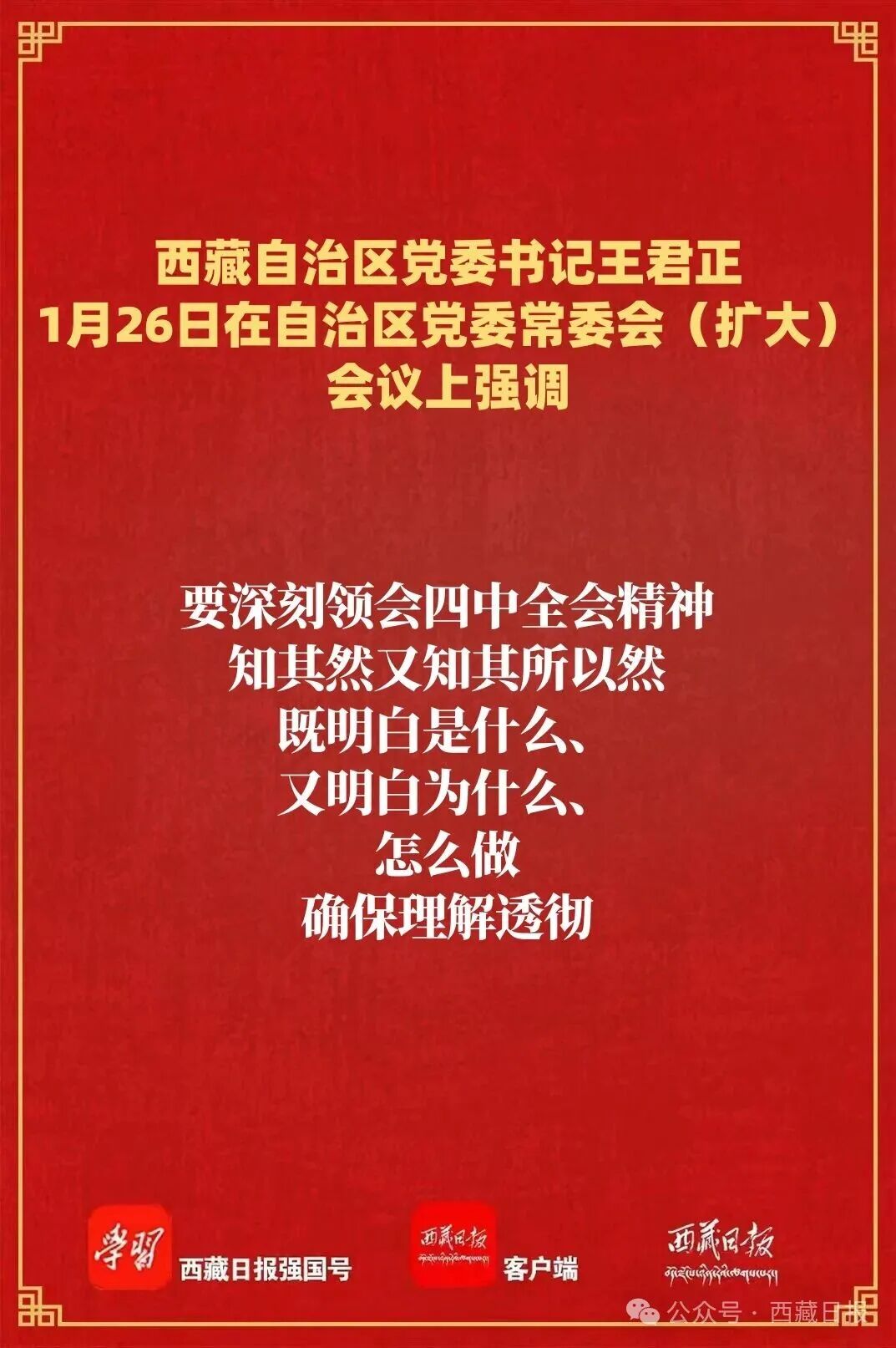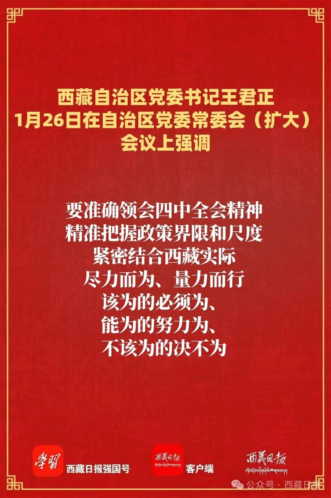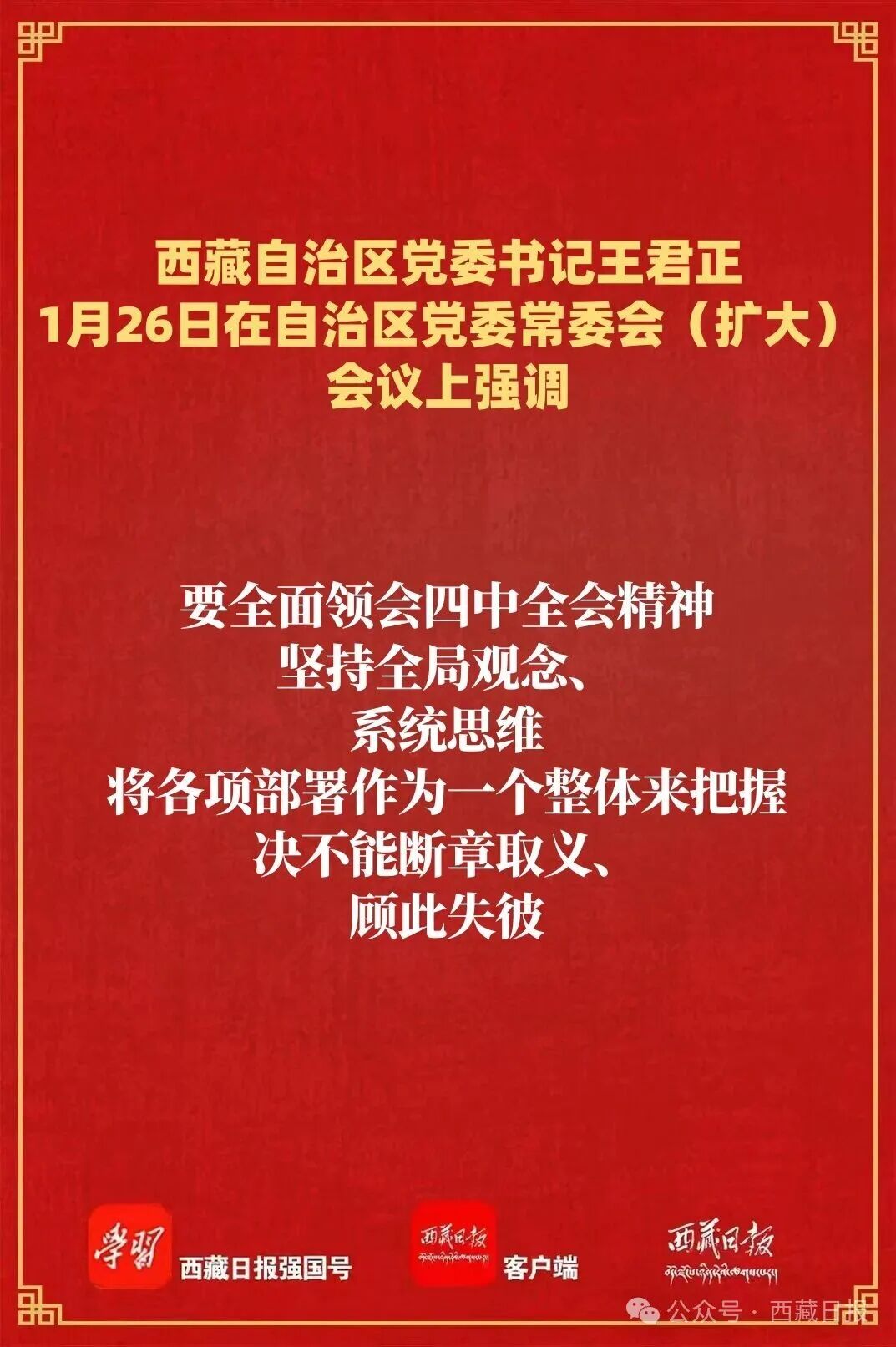 1月26日,自治區(qū)黨委書記王君正主持召開自治區(qū)黨委常委會(擴(kuò)大)會議,認(rèn)真?zhèn)鬟_(dá)學(xué)習(xí)習(xí)近平總書記在省部級主要領(lǐng)導(dǎo)干部學(xué)習(xí)貫徹黨的二十屆四中全會精神專題研討班開班式上的重要講話精神。強(qiáng)調(diào),要深入學(xué)習(xí)習(xí)近平總書記重要講話精神,全面深刻準(zhǔn)確領(lǐng)會和把握黨的二十屆四中全會精神,持之以恒抓好穩(wěn)定、發(fā)展、生態(tài)、強(qiáng)邊四件大事落實(shí),確保“十五五”開好局、起好步,為社會主義現(xiàn)代化新西藏建設(shè)打下堅(jiān)實(shí)基礎(chǔ)。