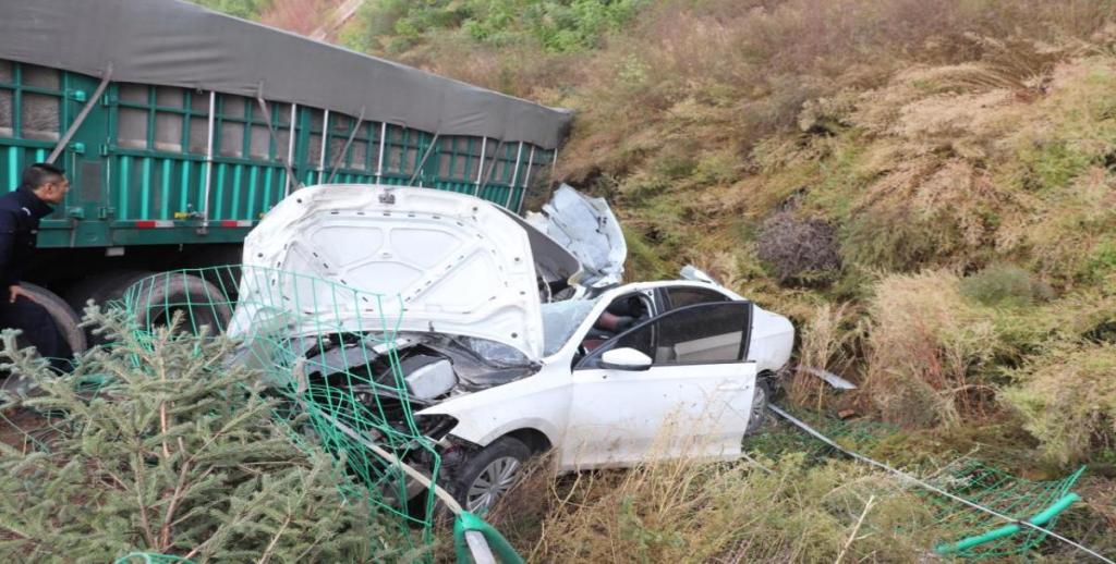 小轎車偏離路線駛?cè)雽?duì)向車道碰撞半掛車