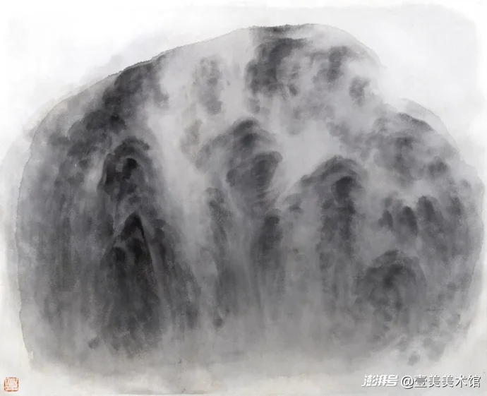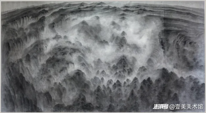 傳統(tǒng)尺幅的山水畫(huà)具有寄情、賞玩的屬性,因此畫(huà)中筆墨精巧,技法千變?nèi)f化,對(duì)畫(huà)面經(jīng)營(yíng)精益求精,令畫(huà)家和觀者陶醉。但在巨幅尺寸面前,傳統(tǒng)的筆墨技法基本失效,即使是紙張的收縮膨脹都會(huì)消解無(wú)數(shù)細(xì)節(jié),此時(shí)對(duì)宣紙?zhí)匦缘恼J(rèn)知、墨色的厚度、透明度與層次控制、筆觸的輕重緩急都沒(méi)有章法可循,一切進(jìn)入未知領(lǐng)域,徐龍森踏入一片前無(wú)古人的虛空??尚业氖牵虾2┪镳^多年的觀摩起到了決定性作用,徐龍森內(nèi)化的藝術(shù)眼光讓他在經(jīng)年的努力后,基本解決了大幅繪畫(huà)的技術(shù)難題。徐龍森開(kāi)始嘗試將墨色進(jìn)行浮雕般的分層建構(gòu),再慢慢過(guò)渡暈染,走到這一步,便開(kāi)始思考畫(huà)面中的空間關(guān)系與光影效果。此時(shí)的作品,再不局限于“胸中丘壑”,而著重空間意境營(yíng)造;不再停留于煙云霧靄表層刻畫(huà),而突出光影效果表達(dá)。畫(huà)面虛白之處,也不是傳統(tǒng)山水詩(shī)意留白的審美范式,而是徹底擺脫了山水畫(huà)中“咫尺千里”的空間想象和敘事局限。我們自此在徐龍森的畫(huà)面中看不到樹(shù),更看不到人,他此后的山水畫(huà)就再不是“臥游”之物。因?yàn)楫?huà)中沒(méi)有參照物,沒(méi)有坐標(biāo)系,甚至就不是山水畫(huà),而是一片展開(kāi)的充滿恒星、黑洞甚至蟲(chóng)洞的宇宙,是一片混沌的洪荒,是一團(tuán)虛無(wú)縹緲的光,是一片無(wú)始無(wú)終無(wú)窮無(wú)盡的時(shí)空,是一個(gè)無(wú)與倫比的奇點(diǎn)。那么,筆墨和技法在此早已不是問(wèn)題了。
