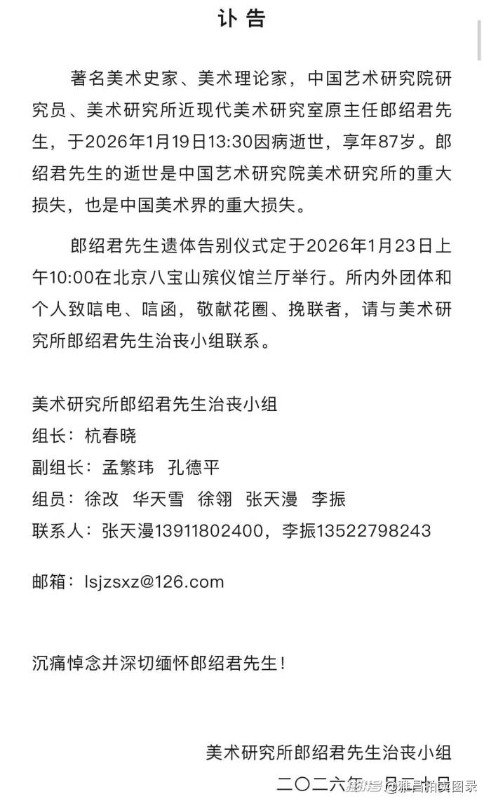 2026年1月19日,著名美術(shù)史家、美術(shù)理論家,中國(guó)藝術(shù)研究院研究員、美術(shù)研究所近現(xiàn)代美術(shù)研究室原主任郎紹君先生因病逝世,享年87歲。