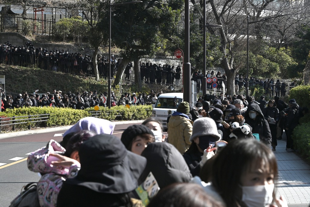 1月27日,日本東京,人們聚集在上野動(dòng)物園附近,等待運(yùn)載“曉曉”和“蕾蕾”的卡車經(jīng)過。
