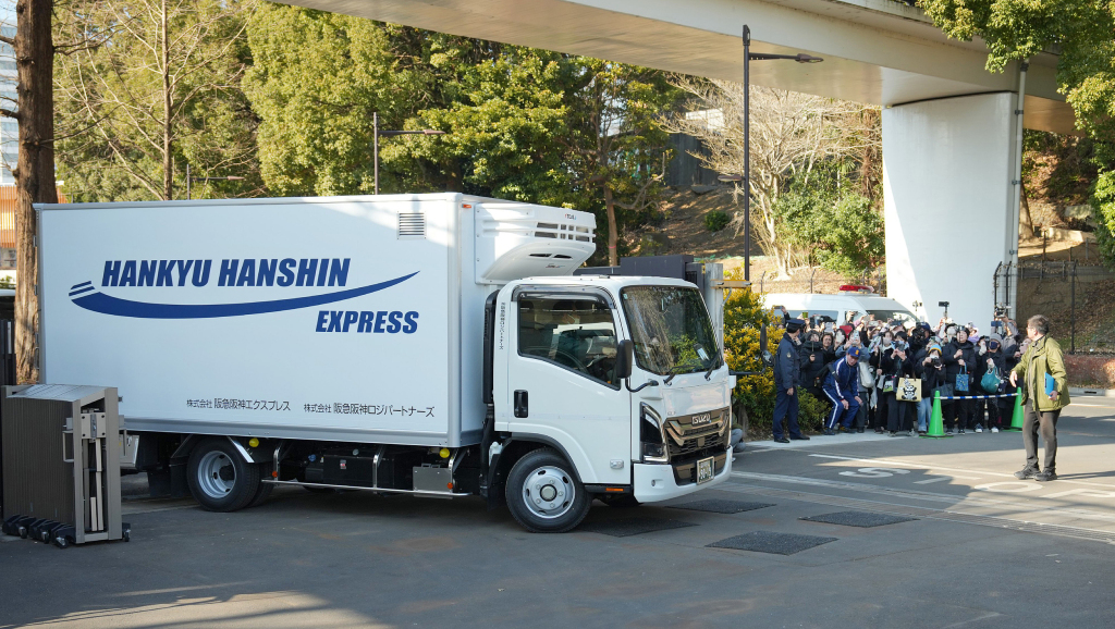 1月27日,旅日大熊貓“曉曉”和“蕾蕾”由卡車運(yùn)載從東京上野動(dòng)物園出發(fā),踏上回國之旅。