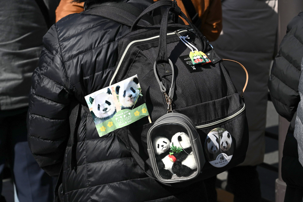 1月27日,日本東京,前來送行的民眾背著大熊貓“曉曉”“蕾蕾”的毛絨玩具和旗子。