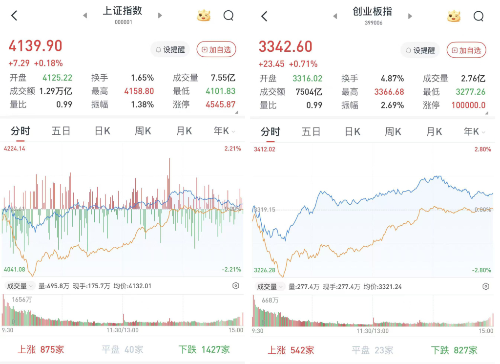 至收盤,上證綜指漲0.18%,報(bào)4139.9點(diǎn);科創(chuàng)50指數(shù)漲1.51%,報(bào)1555.98點(diǎn);深證成指漲0.09%,報(bào)14329.91點(diǎn);創(chuàng)業(yè)板指漲0.71%,報(bào)3342.6點(diǎn)。