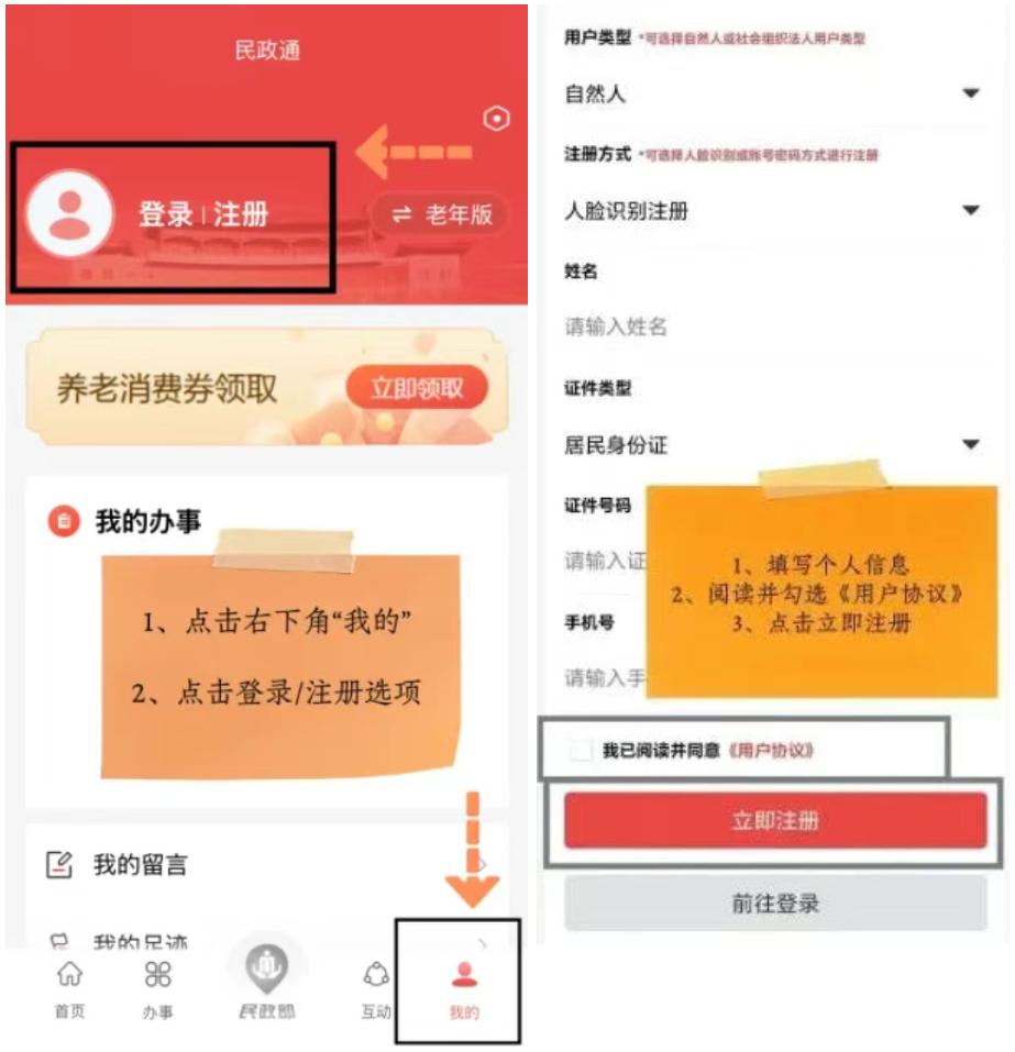 打開“民政通”APP或小程序完成注冊,成功登錄后,進入主頁。