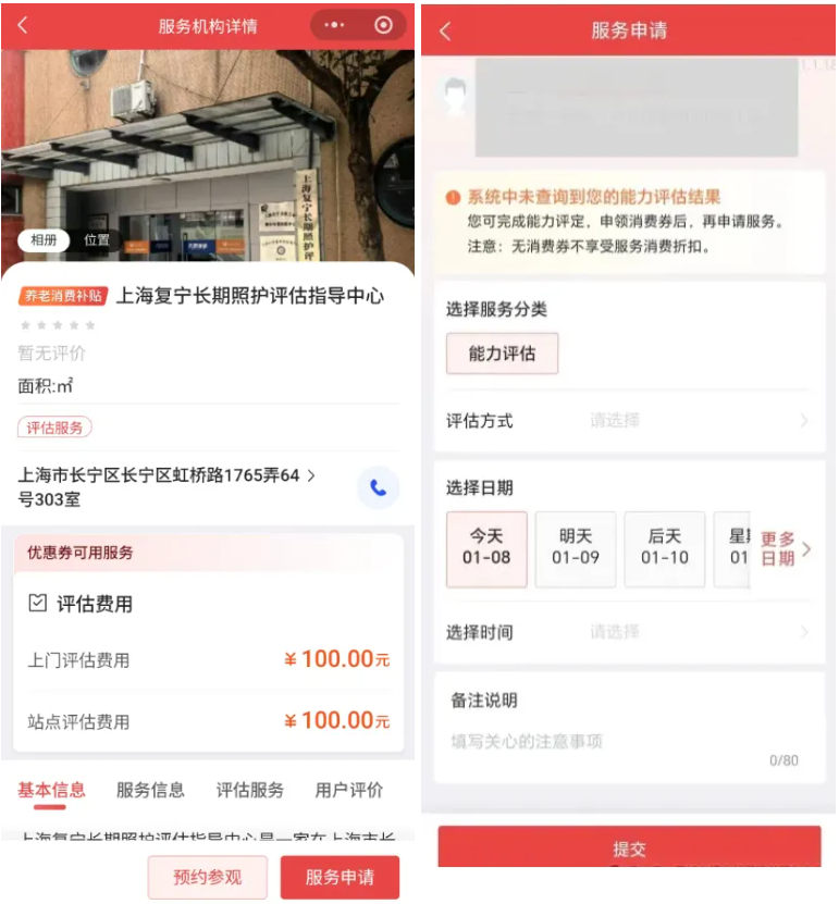 系統(tǒng)會顯示您所在區(qū)域附近的評估機構(gòu)列表供您選擇,點擊相應(yīng)評估機構(gòu)的“服務(wù)申請”按鈕,選擇評估方式,預(yù)約時間,點擊提交。