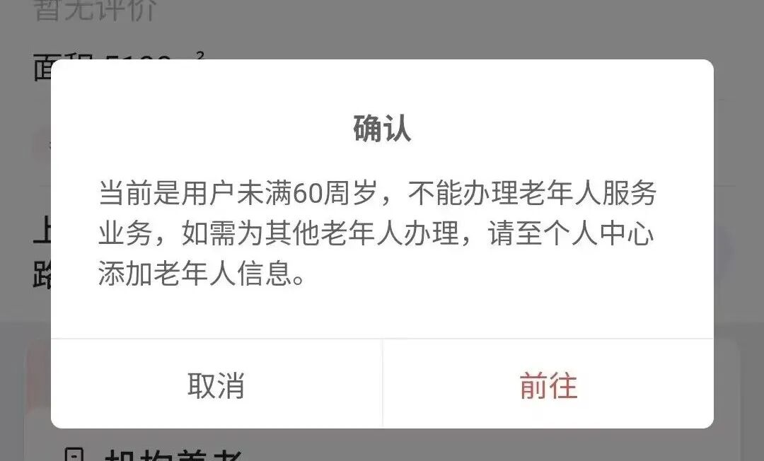 點擊“服務(wù)申請”后, 如果頁面彈出一個要求添加老年人信息的對話框,點擊對話框中的“前往”按鈕,進入“個人中心”頁面。