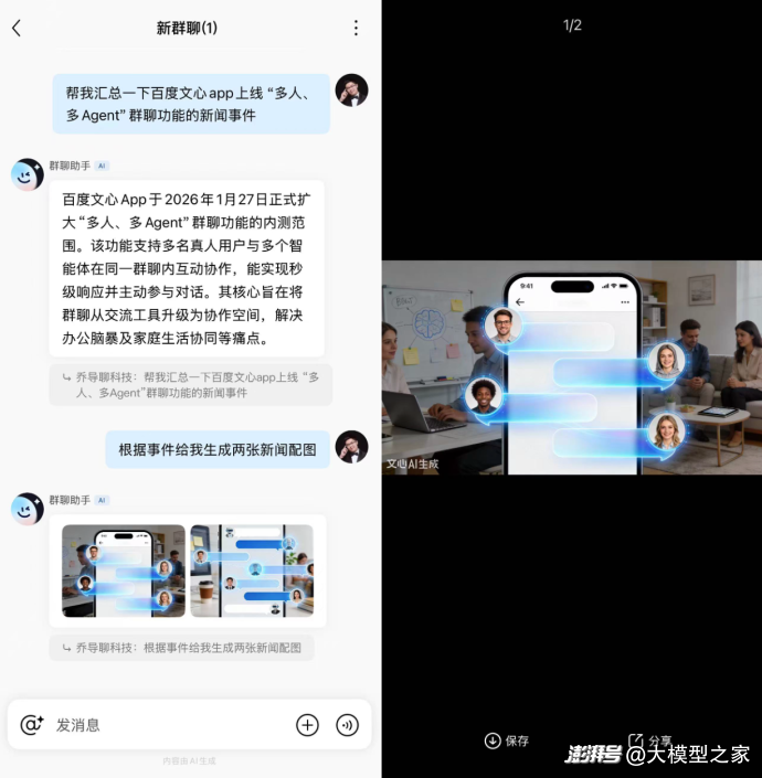 幾乎同步地,騰訊元寶和百度文心都拋出了各自的新功能。騰訊在26日啟動(dòng)了名為“元寶派”的內(nèi)測,主打社交寫作與協(xié)作;百度則在27日開啟了文心APP“多人、多Agent”群聊功能的新一輪內(nèi)測,讓AI不再只是和一個(gè)人對(duì)話,而是進(jìn)入一個(gè)真實(shí)存在的群聊空間,成為“群里的一員”。