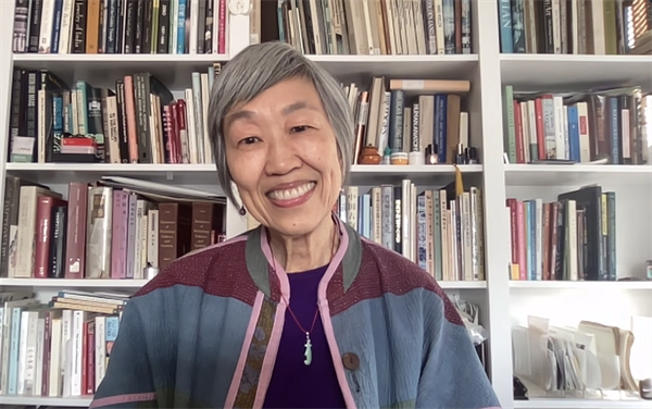 2025年12月底,我終于如愿以償。視頻接通的那一刻,她銀灰色的短發(fā)修剪得清爽利落,散發(fā)著理性而克制的光澤;衣著樸素,卻富有層次感;頸間佩戴一枚蘋果綠的刀形玉飾,溫潤之中隱隱透出鋒銳。她面帶笑容,眼中有光,神態(tài)溫和從容。身后是一整面書架,書籍密密排列,角落里擺放著幾瓶化妝品、護(hù)膚品等日常物件,無意間流露出這位學(xué)者在嚴(yán)謹(jǐn)學(xué)術(shù)之外,細(xì)膩而愛美的一面。