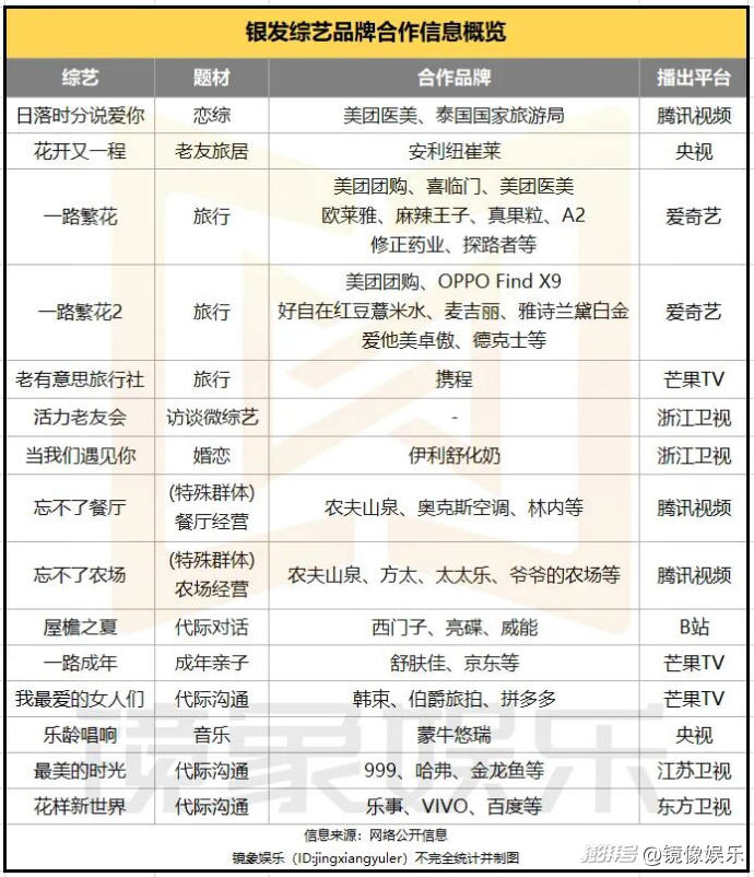 此前,鏡象娛樂曾在《銀發(fā)營銷風(fēng)起:取悅的不止中老年人,也在反向收割年輕人》一文中詳細(xì)梳理過中老年明星代言增長,品牌營銷圍繞時(shí)代情緒變遷的敘事演變。如今再來觀察,品牌除了綁定中老年明星的合作方式之外,也開始集中看向銀發(fā)綜藝。