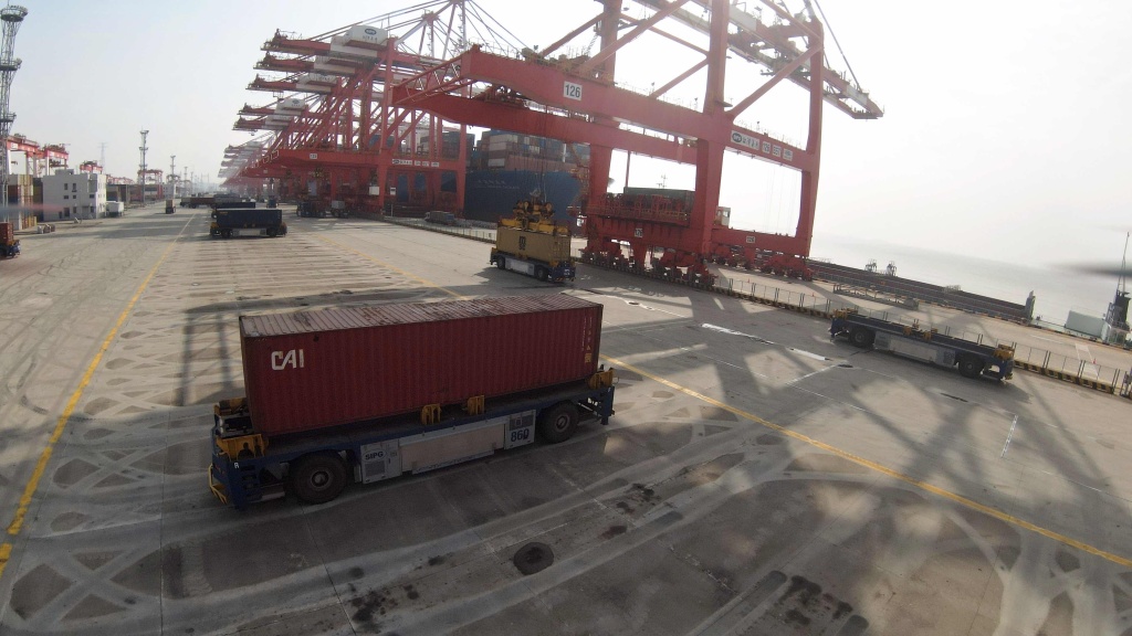 1月27日,上海關(guān)區(qū)首票水水中轉(zhuǎn)多式聯(lián)運(yùn)進(jìn)口集裝箱在洋山四期自動(dòng)化碼頭等待接駁轉(zhuǎn)運(yùn)。上海海關(guān)供圖