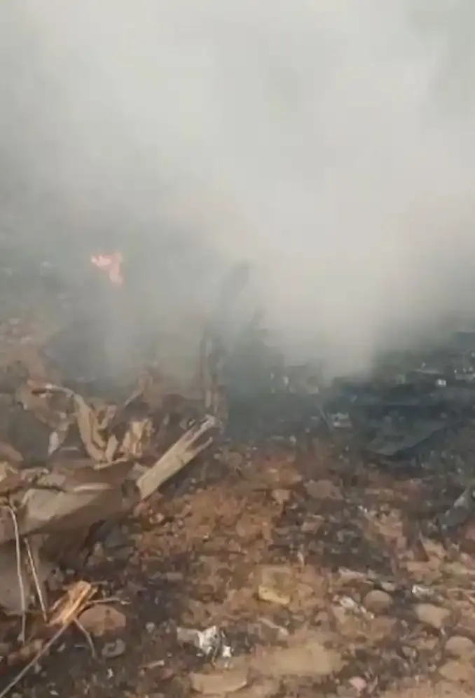 現(xiàn)場(chǎng)畫(huà)面顯示,墜機(jī)現(xiàn)場(chǎng),飛機(jī)損毀嚴(yán)重,殘骸四散,滾滾濃煙從部分殘骸中升起。