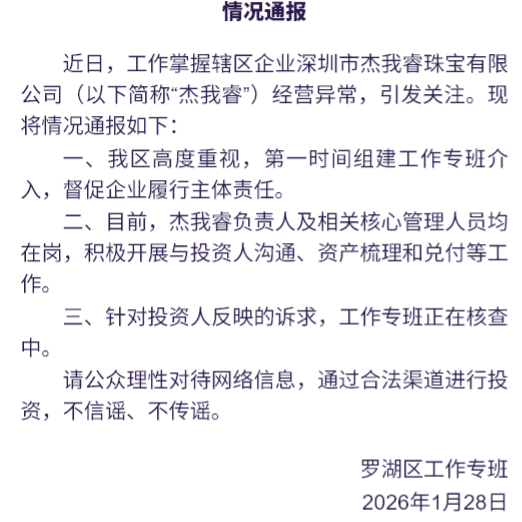 1月28日,據(jù)“羅湖Plus”,羅湖區(qū)工作專班發(fā)布《情況通報(bào)》,近日,工作掌握轄區(qū)企業(yè)深圳市杰我睿珠寶有限公司(以下簡稱“杰我?!保┙?jīng)營異常,引發(fā)關(guān)注。