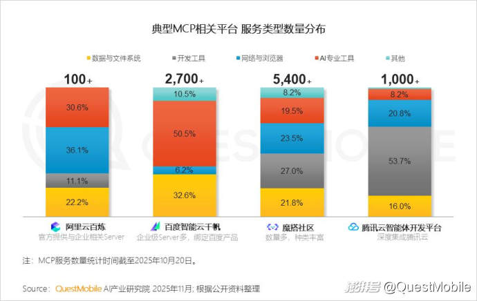 同時,協(xié)議標準(MCP)、智能體協(xié)作(A2A)以及端側(cè)生態(tài)的互聯(lián),正在重構(gòu)互聯(lián)網(wǎng)底層的操作系統(tǒng)。以國內(nèi)四大典型MCP相關(guān)平臺為例,魔搭社區(qū)的服務類型總數(shù)量已經(jīng)超過5400種。這當中,與AI商業(yè)化密切相關(guān)是“支付MCP服務(微信支付、支付寶)”,不僅讓行動可以落地,更能完成支付閉環(huán),帶來巨大的商業(yè)化機會……