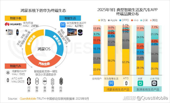 QuestMobile數(shù)據(jù)顯示,鴻蒙家居生態(tài)下的華為智慧生活APP與汽車生態(tài)下的AITO APP用戶終端品牌中,華為品牌占比分別達到58.2%和52.2%,顯著高出全網(wǎng)平均結(jié)構(gòu),顯示出用戶較強的品牌忠實度。