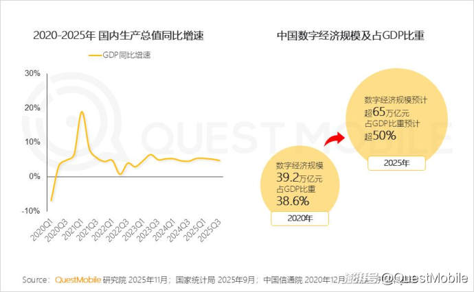 今天給大家分享一下中國移動互聯(lián)網(wǎng)2025-2026年度核心趨勢。QuestMobile數(shù)據(jù)顯示,2025年是中國數(shù)字經(jīng)濟從“量變”轉(zhuǎn)向“質(zhì)變”的關(guān)鍵分水嶺,預計全年數(shù)字經(jīng)濟規(guī)模將超65萬億元,占GDP比重突破50%,正式成為國民經(jīng)濟的核心引擎。