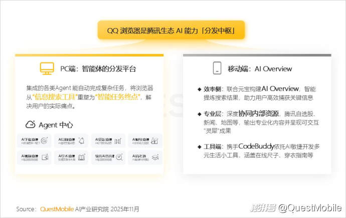 2.6 QQ瀏覽器正從傳統(tǒng)工具升級為“智能體分發(fā)平臺+AI搜索入口”,通過整合騰訊內(nèi)外部資源,強化AI能力,提升信息獲取效率和場景化服務能力