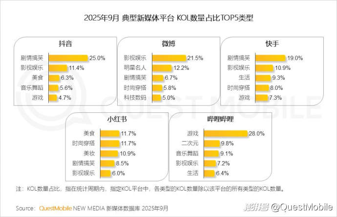 3.2新媒體平臺具有獨特的“內(nèi)容基因”,抖音、快手劇情搞笑和影視娛樂內(nèi)容占主導,微博成為粉絲與話題廣場,小紅書的美食、時尚、美妝內(nèi)容構(gòu)成精致生活指南,嗶哩嗶哩的游戲和二次元文化構(gòu)筑其核心壁壘