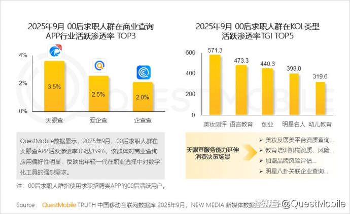 QuestMobile數(shù)據(jù)顯示,截止2025年9月,天眼查APP月活躍用戶規(guī)模達2802萬,同比增長6.9%,核心用戶群體高度聚焦于90后,其活躍占比達32.7%,同比提升5.7%。