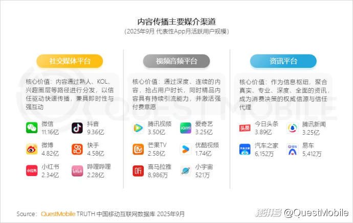 3、 社交媒體、音視頻及資訊平臺已成為內(nèi)容傳播的主陣地,其差異化價值日益凸顯