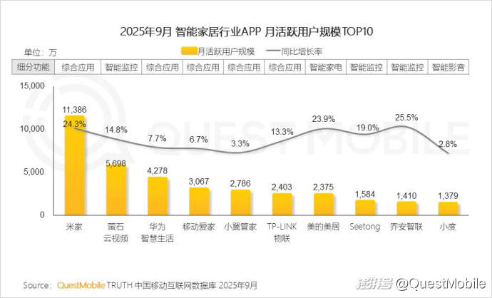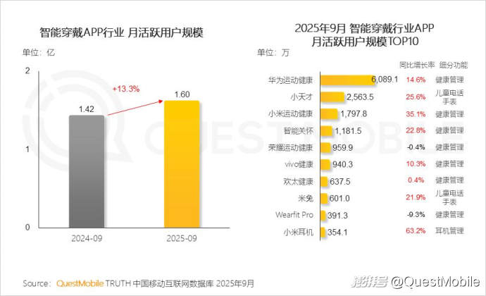 QuestMobile數(shù)據(jù)顯示,2025年9月智能穿戴APP行業(yè)規(guī)模同比增長13.3%,達1.60億,其中華為運動健康、小天才、小米運動健康APP月活躍用戶規(guī)模同比增幅分別為14.6%、25.6%、35.1%,規(guī)模達到6089.1萬、2563.5萬、1797.8萬。