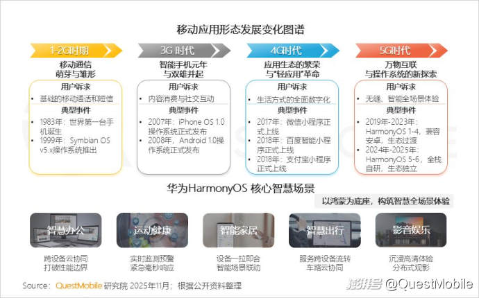 1.2 在5G、AIoT等技術(shù)逐步成熟與用戶場景化需求雙重驅(qū)動下,操作系統(tǒng)從連接“人與人”的功能平臺,演進為服務“人與萬物”的智慧生態(tài),鴻蒙系統(tǒng)的崛起,標志進入以場景為中心的新階段