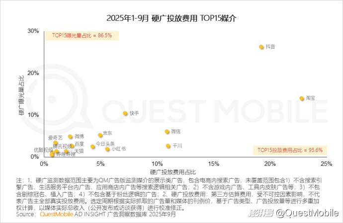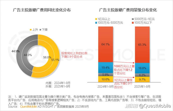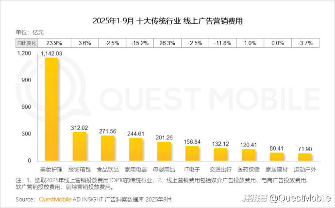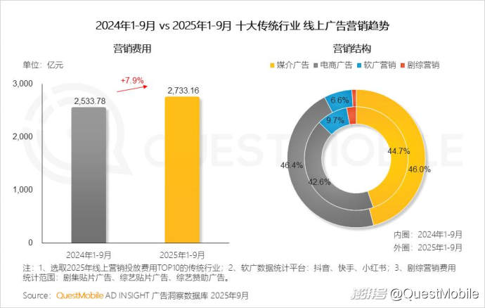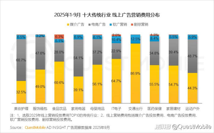 從2025年1-9月十大傳統(tǒng)行業(yè)的線上營銷結(jié)構(gòu)可以看出,媒介廣告根基穩(wěn)固,電商廣告持續(xù)強化,增幅達3.8個百分點,表明廣告主對關(guān)聯(lián)銷售轉(zhuǎn)化的營銷預算傾斜。