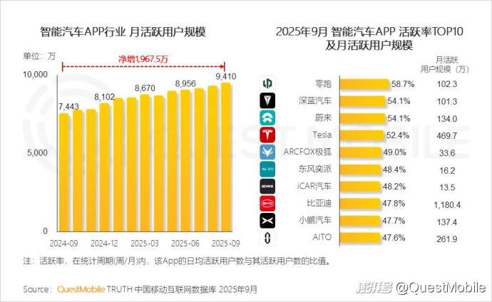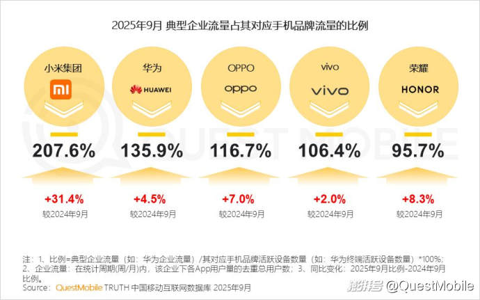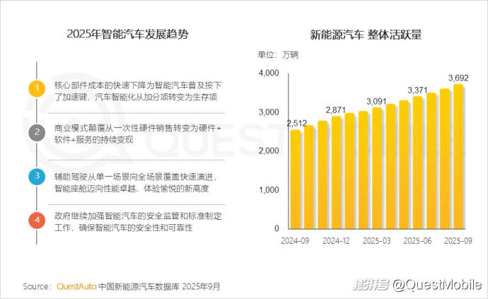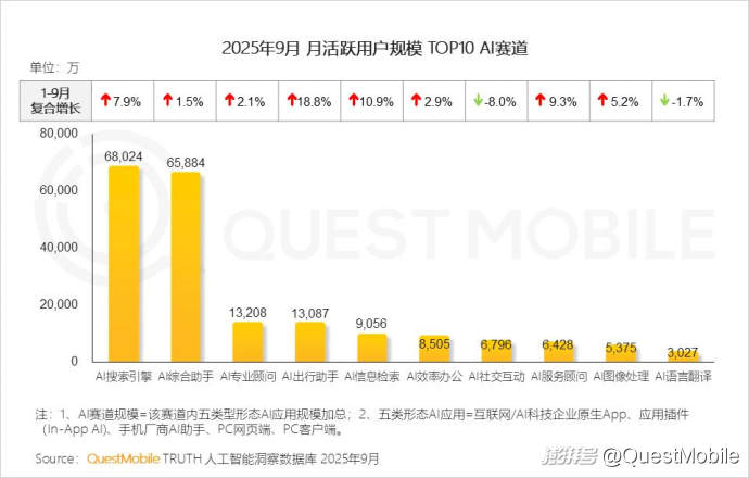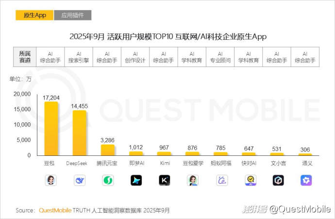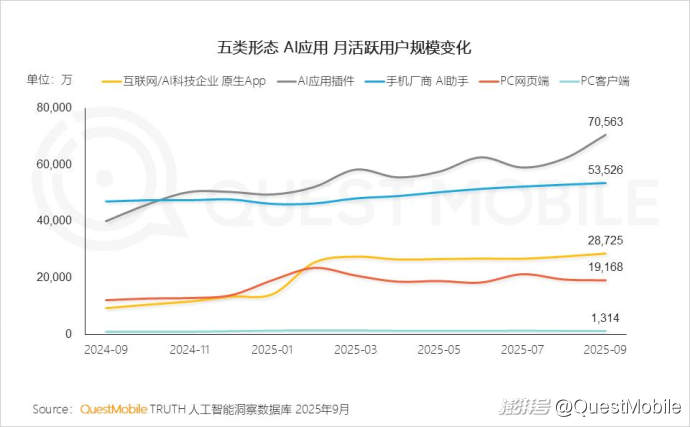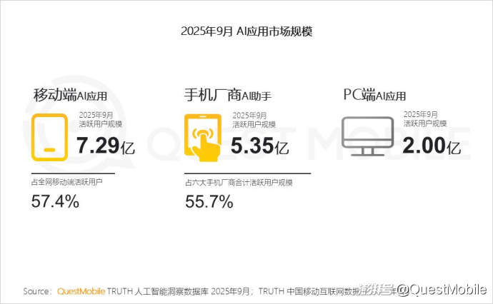 QuestMobile數(shù)據(jù)顯示,2025年9月,移動端、手機廠商AI助手及PC端,用戶規(guī)模分別達7.29億、5.35億和2.00億。