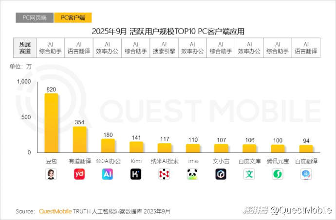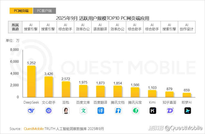 QuestMobile數(shù)據(jù)顯示,2025年9月,絕大部分TOP10 PC端網(wǎng)頁應用來自頭部互聯(lián)網(wǎng)集團,如百度、抖音、騰訊;文心助手、豆包、騰訊文檔網(wǎng)頁端用戶規(guī)模分別達3,426萬、2,572萬和1,854萬。