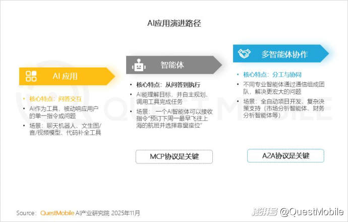 4.1 AI能力沿“工具屬性”到“個體智能”再到“群體智能”進階,核心驅(qū)動是協(xié)議層(MCP到A2A)的技術(shù)突破,以及能力維度和場景復雜度的持續(xù)升級