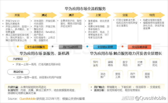 1.3華為應用市場已演進為應用生態(tài)中樞,提供貫穿全生命周期的開發(fā)者服務,助力開發(fā)者開發(fā)、適配及運營效率的提升;同時,鴻蒙生態(tài)以“共建精品” 和“增益價值” 為核心,重塑內(nèi)容與服務邊界,實現(xiàn)與開發(fā)者共贏