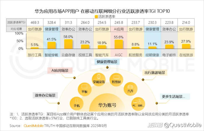 QuestMobile數(shù)據(jù)顯示,華為應用市場APP用戶在出行旅游、健康管理、效率辦公、AI應用等多場景行業(yè)展現(xiàn)出明顯偏好。