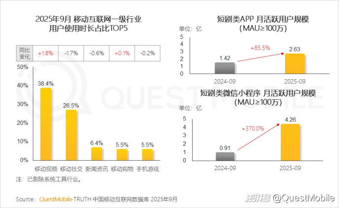 QuestMobile數(shù)據(jù)顯示,截至2025年9月,移動視頻以38.4%的用戶使用時長占比穩(wěn)居各行業(yè)之首,同比提升1.8%,反映出視頻內(nèi)容在吸引和維持用戶注意力方面的顯著優(yōu)勢;與此同時,短劇作為視頻生態(tài)中的重要分支,呈現(xiàn)高速擴張趨勢:百萬月活規(guī)模以上的短劇類APP活躍用戶達2.63億,同比增長85.5%;短劇類微信小程序活躍用戶更達到4.26億,實現(xiàn)370%的同比大幅提升,顯示出其強大的用戶觸達能力和生態(tài)滲透力。