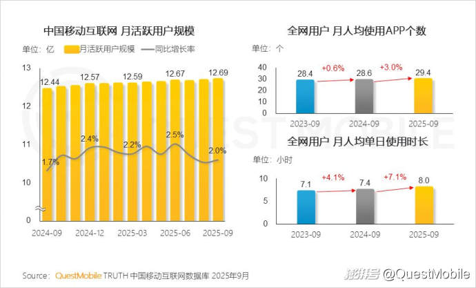 QuestMobile數(shù)據(jù)顯示,移動互聯(lián)網(wǎng)活躍用戶規(guī)模增速已趨于平穩(wěn),人均使用APP個數(shù)穩(wěn)定在29個左右,行業(yè)增長引擎轉(zhuǎn)向用戶深度運營與存量價值的挖掘,全網(wǎng)用戶月人均單日使用時長達8小時,呈現(xiàn)加速提升態(tài)勢。