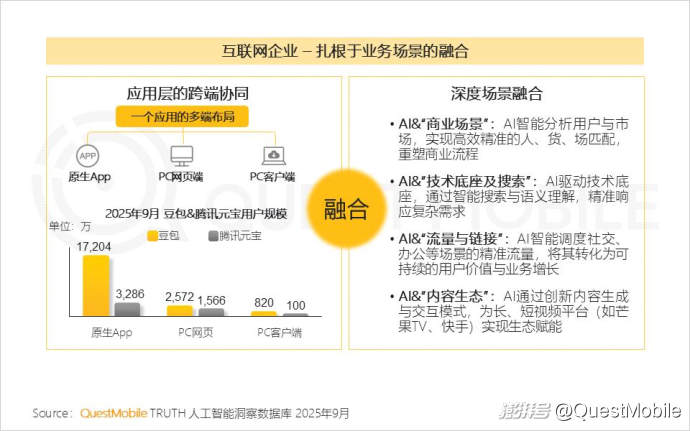 3.1 互聯(lián)網(wǎng)企業(yè)將AI進行多維深度整合,通過多端布局覆蓋應用層,聚焦業(yè)務場景,以AI為“倍增器”嵌入主業(yè)全流程,強化核心競爭力并培育新增長點