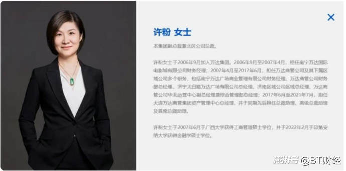 公開履歷顯示,許粉是在萬達歷練了20年的老將。許粉于2006年9月加入萬達集團,最初擔任南寧萬達國際電影城有限公司財務經(jīng)理。此后她在萬達商管公司及其下屬區(qū)域公司擔任多個職務,2021年6月成為北區(qū)負責人。后出任大連萬達商管集團資產(chǎn)管理中心總經(jīng)理、總裁助理等職,2025年許粉擔任珠海萬達商管副總裁兼北區(qū)公司總裁,同時兼任北京、鄭州等地萬達廣場商業(yè)管理公司執(zhí)行董事、經(jīng)理等職務。2023年榮獲“全國巾幗建功標兵”稱號,是王健林一手提拔上來的女高管。