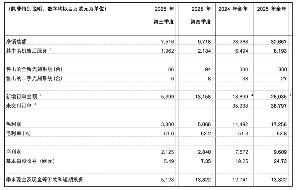 ASML 2025年全年凈銷售額達327億歐元,毛利率為52.8%,凈利潤為96億歐元。截至2025年底,ASML的未交付訂單金額為388億歐元。