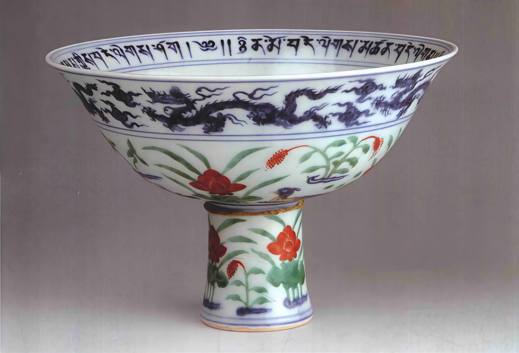 明宣德 青花五彩鴛鴦蓮池紋高足碗
