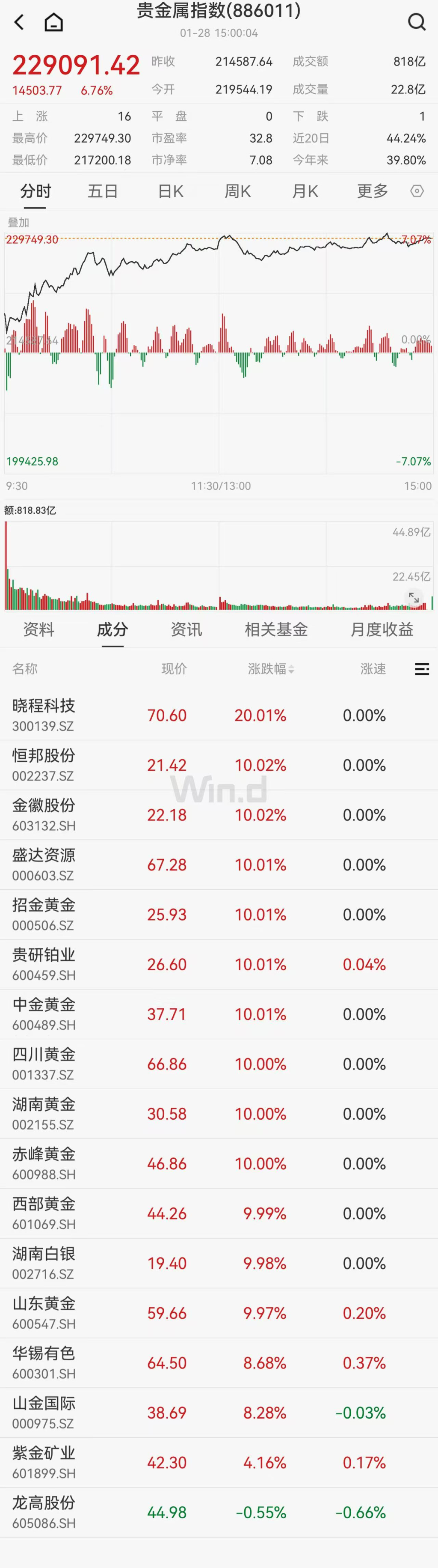 A股市場方面,黃金、有色金屬板塊1月28日掀漲停潮。Wind數據顯示,截至收盤,貴金屬指數大漲6.76%,曉程科技(300139)、浩通科技(301026)、常鋁股份(002160)、鋅業(yè)股份(000751)、白銀有色(601212)、羅平鋅電(002114)等超30股漲?;驖q超10%。