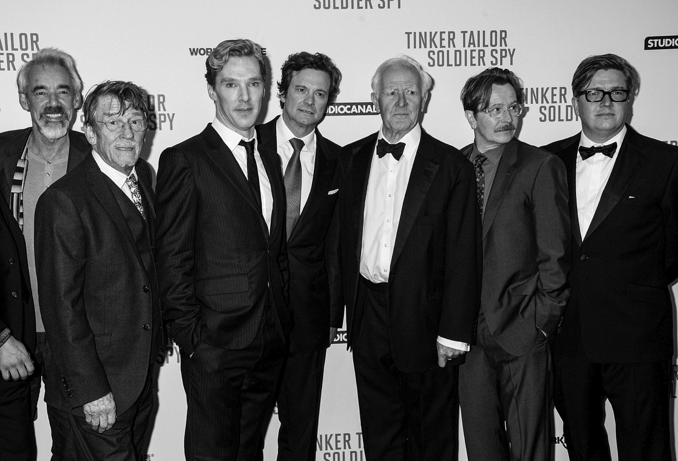 勒卡雷與《鍋匠,裁縫,士兵,間諜》2011年電影版的劇組:羅杰·勞埃德-派克、約翰·赫特、本尼迪克特?康伯巴奇、科林·費(fèi)斯、加里·奧德曼和導(dǎo)演托馬斯·阿爾弗雷德松。