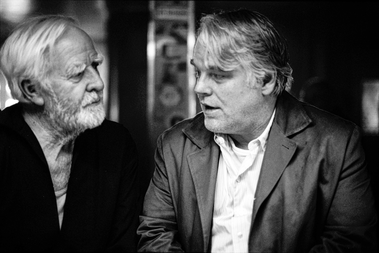 勒卡雷與菲利普·西摩·霍夫曼在電影《頭號(hào)罪犯》的拍攝現(xiàn)場(chǎng),2014年。勒卡雷客串了一個(gè)骯臟酒吧里的角色,為此留了胡子。