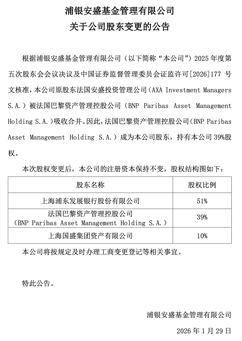 1月29日,浦銀安盛基金管理有限公司(下稱“浦銀安盛基金”)發(fā)布一則關(guān)于公司股東變更的公告。