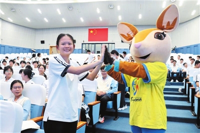 上海外國語大學(xué)三亞附屬中學(xué)學(xué)生與三亞亞沙會(huì)吉祥物“亞亞”互動(dòng)。