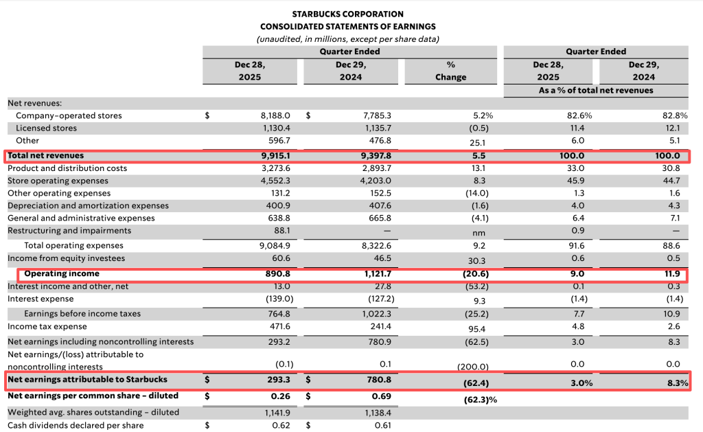 1月28日美股盤前,全球連鎖咖啡星巴克(Nasdaq:SBUX)發(fā)布截至2025年12月28日的2026財(cái)年第一財(cái)季業(yè)績(jī)報(bào)告。第一財(cái)季總凈收入為99.15億美元,同比增長(zhǎng)5.5%;營(yíng)業(yè)利潤(rùn)8.91億美元,同比下滑20.6%;歸母凈利潤(rùn)為2.93億美元,同比下滑62.4%。