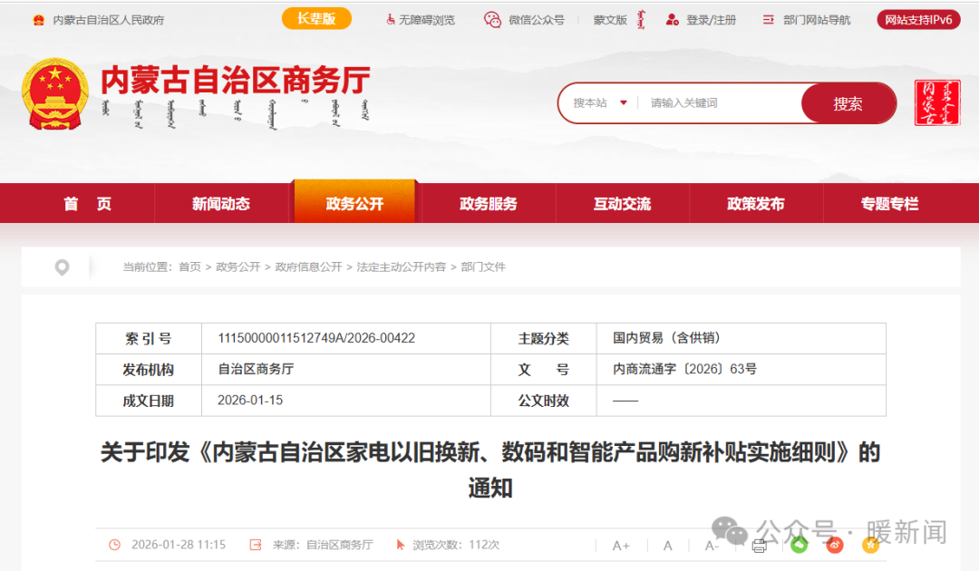 按照《國家發(fā)展改革委 財政部關(guān)于2026年實施大規(guī)模設備更新和消費品以舊換新政策的通知》(發(fā)改環(huán)資〔2025〕1745號)、《商務部等5部門辦公廳(室)關(guān)于做好2026年家電以舊換新、數(shù)碼和智能產(chǎn)品購新補貼工作的通知》(商辦流通函〔2025〕469號)有關(guān)要求,現(xiàn)將《內(nèi)蒙古自治區(qū)家電以舊換新、數(shù)碼和智能產(chǎn)品購新補貼實施細則》印發(fā)給你們,請認真貫徹落實。