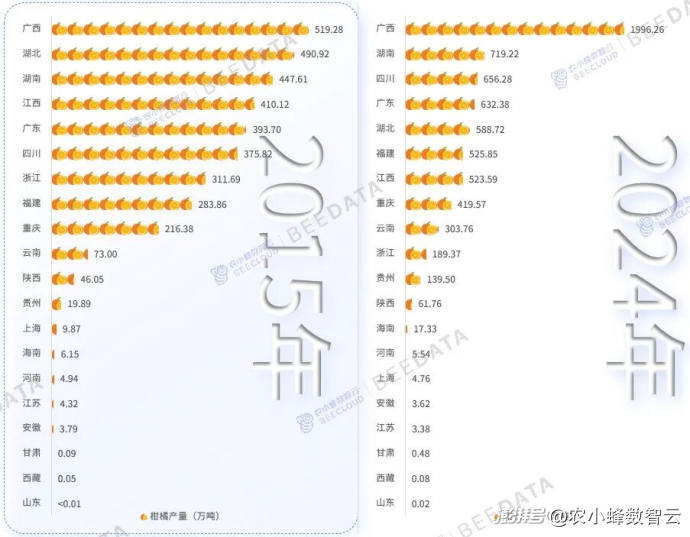2024年,我國柑橘產(chǎn)量排名前三省域依次為廣西、湖南、四川;