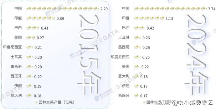 2024年,全球園林水果產(chǎn)量排名前十的國家/地區(qū)依次為中國、印度、巴西、土耳其、墨西哥、印尼、美國、意大利、伊朗、西班牙;