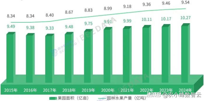 據(jù)聯(lián)合國糧食及農(nóng)業(yè)組織(FAO)數(shù)據(jù)顯示,2024年,全球果園面積為10.27億畝,園林水果產(chǎn)量為9.54億噸;